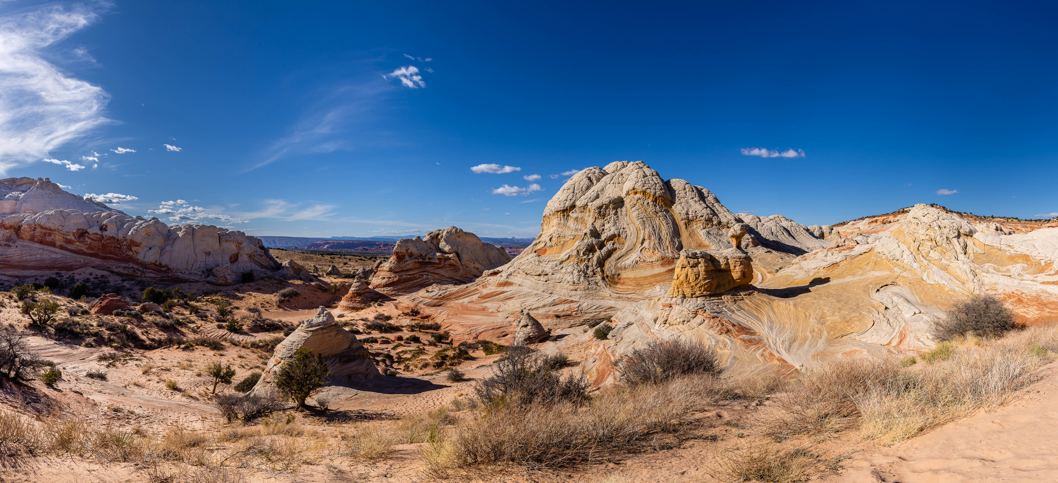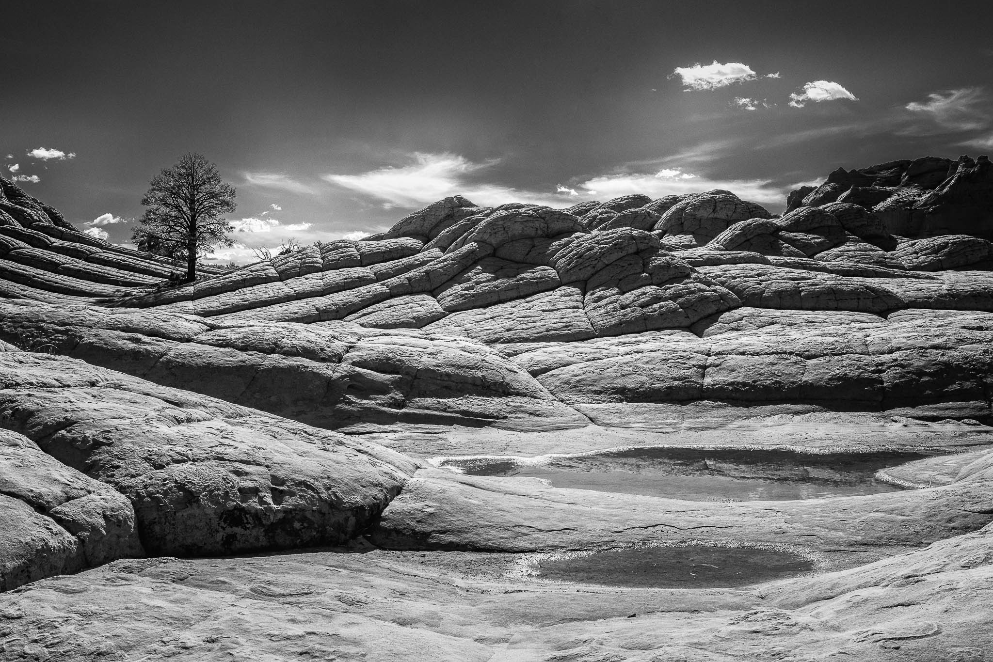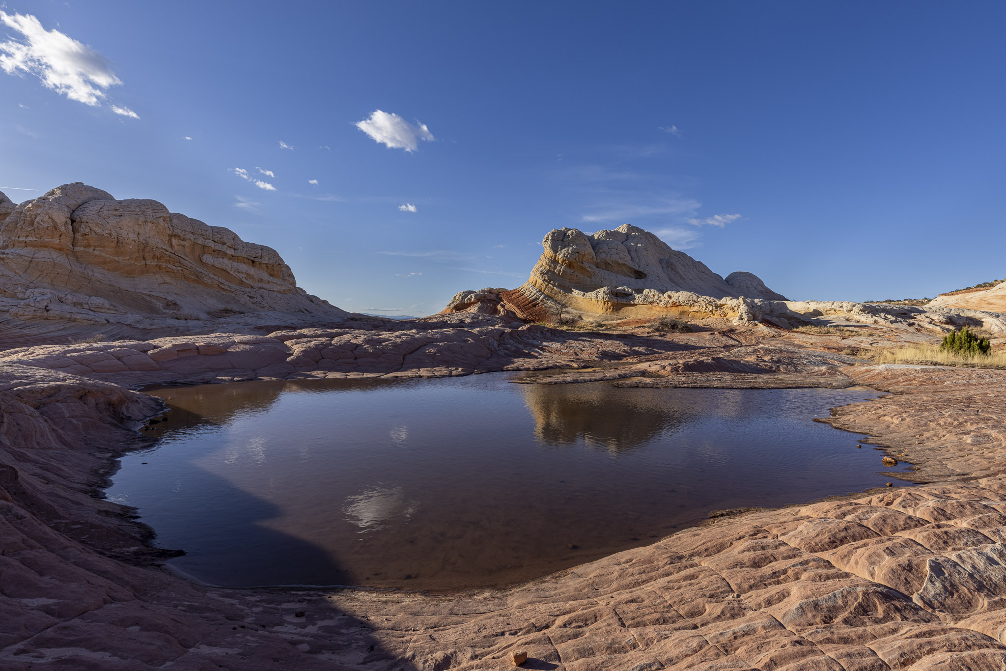Discovered by photographers around 1995, the White Pocket is located in a very remote area within the Bureau of Land Management’s Vermilion Cliffs National Monument. The term “white pocket” refers to an area of white and coral colored cauliflower rock (aka brainrock) to the east of the White Pocket Butte, and has many water pockets which accounts for the name. The White Pocket is small, about a square mile, but is a photographer’s wonderland of multi-colored swirls, twirls and waves. Getting to the White Pocket requires 4 hours round-trip in a special high-clearance vehicle to safely get through the deep sand along the route. It was worth every minute to get there and get back!