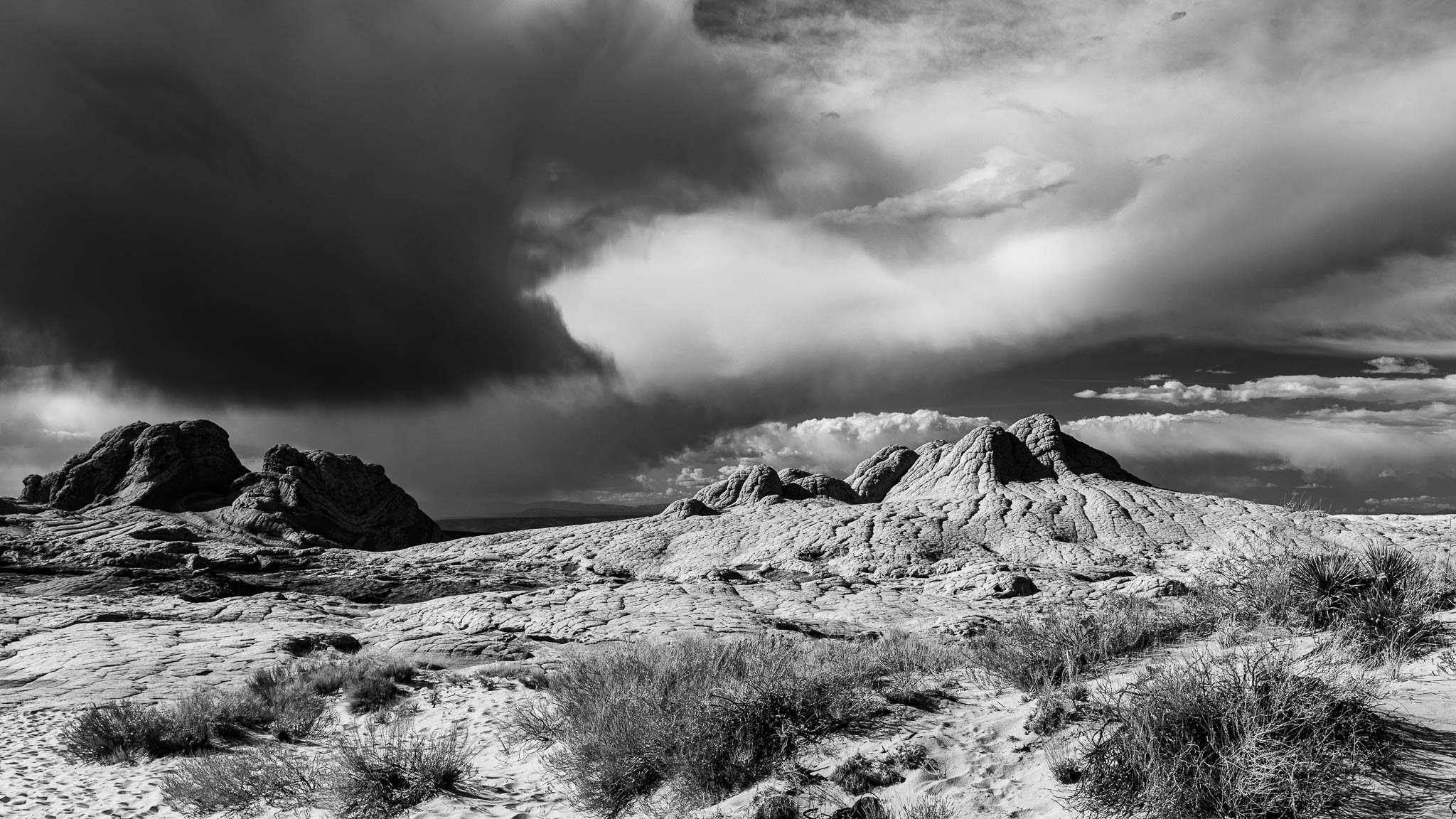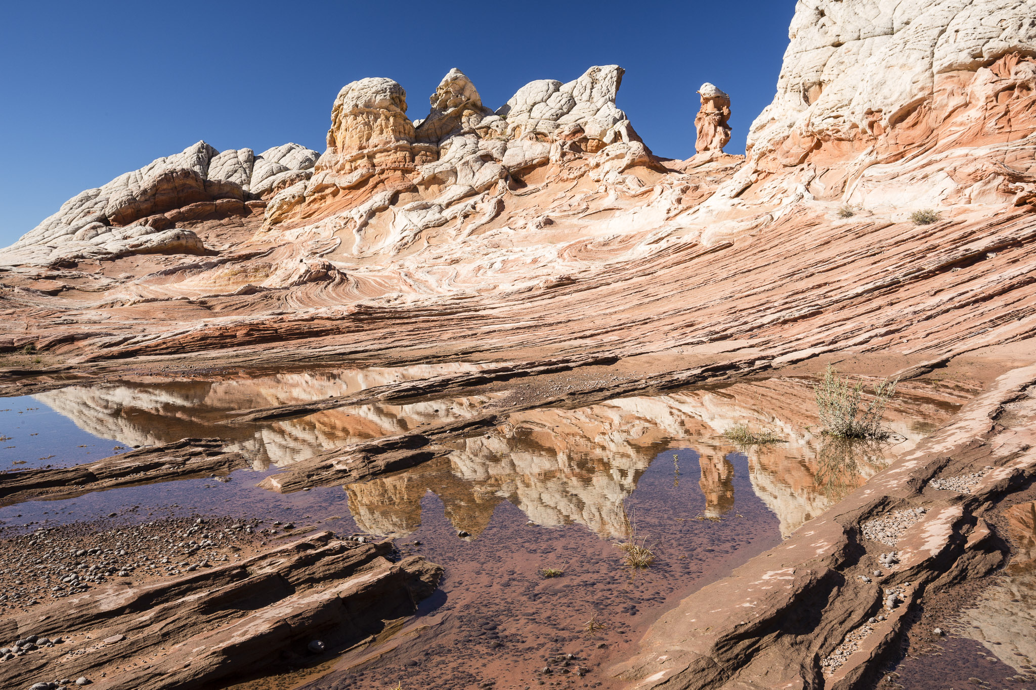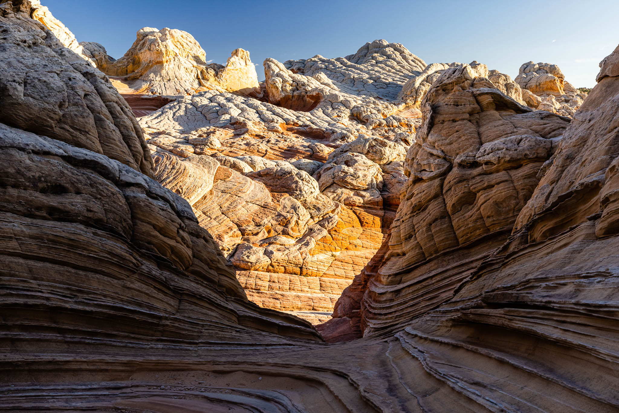 Discovered by photographers around 1995, the White Pocket is located in a very remote area within the Bureau of Land Management’s Vermilion Cliffs National Monument. The term “white pocket” refers to an area of white and coral colored cauliflower rock (aka brainrock) to the east of the White Pocket Butte, and has many water pockets which accounts for the name. The White Pocket is small, about a square mile, but is a photographer’s wonderland of multi-colored swirls, twirls and waves. Getting to the White Pocket requires 4 hours round-trip in a special high-clearance vehicle to safely get through the deep sand along the route. It was worth every minute to get there and get back!